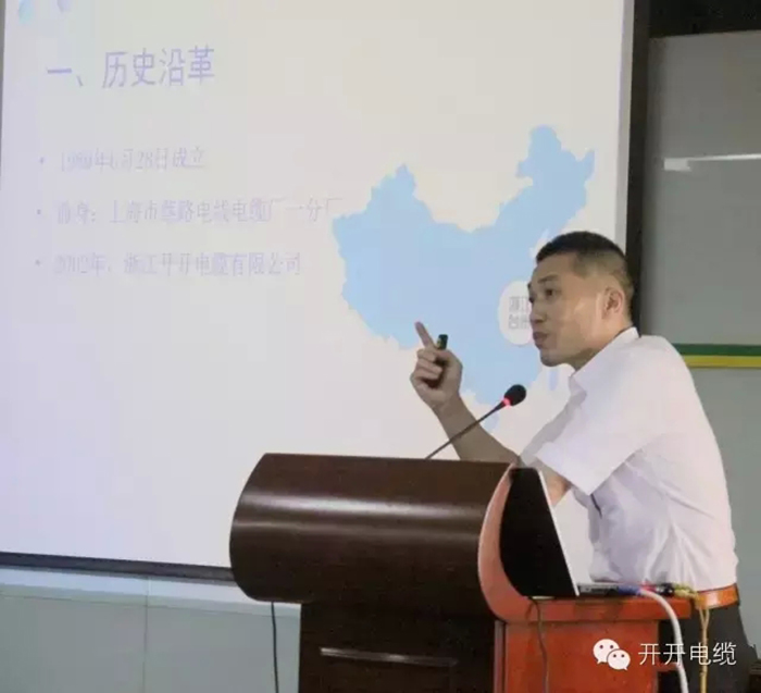 9點45分,開開電纜董事長余紀炎講解開開電纜科技有限公司的歷史沿革、品牌文化、公司榮譽、領導關懷、新廠區(qū)落成等。余董事長充滿激情的介紹,吸引每個經(jīng)銷商客戶仔細聆聽。